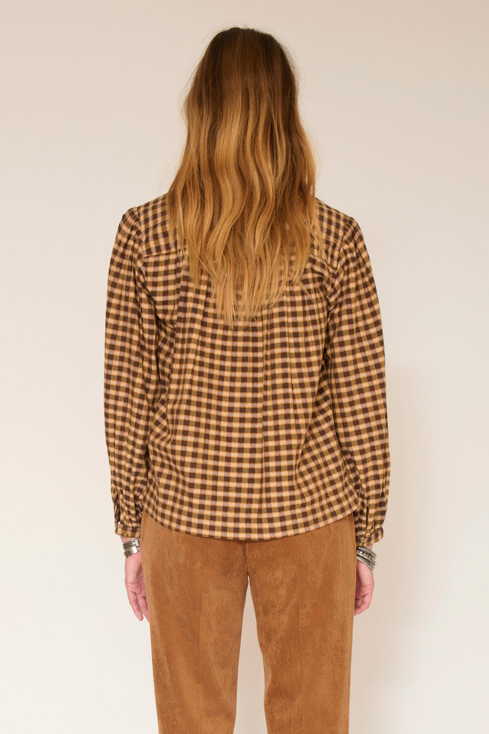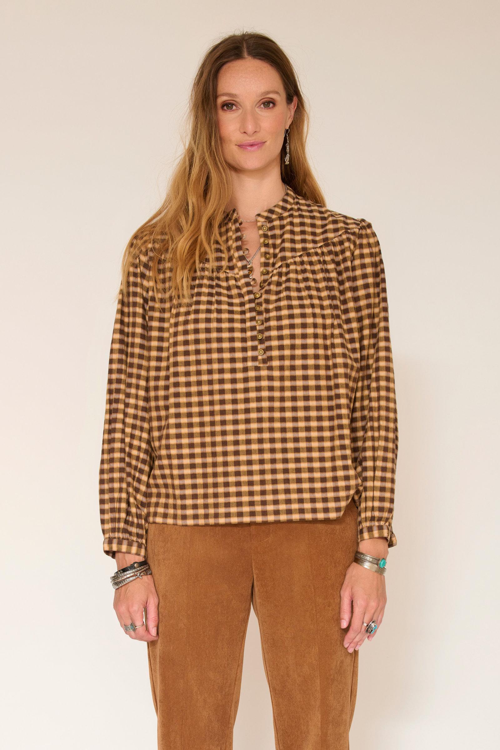 Cette blouse se distingue par son design à carreaux dans des tons de marron et de beige, créant un contraste chaleureux et agréable. Sa coupe ample et ses manches longues lui confèrent une allure décontractée, tandis que le col tunisien légèrement froncé ajoute une touche de féminité à l'ensemble.