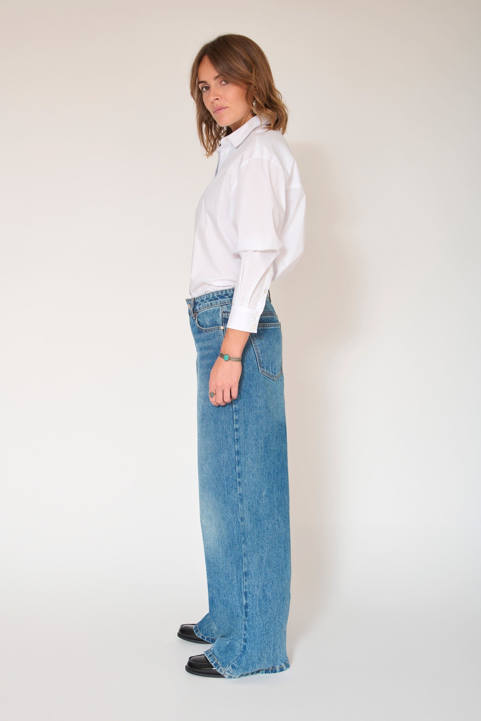 100% coton, ce jean garantit une souplesse et un confort exceptionnels. Sa matière durable permet une bonne liberté de mouvement tout en conservant une structure élégante. La coupe large se distingue par des jambes amples, créant une silhouette décontractée qui s'adapte aisément à divers styles, qu'il s'agisse d'un look casual ou plus habillé.