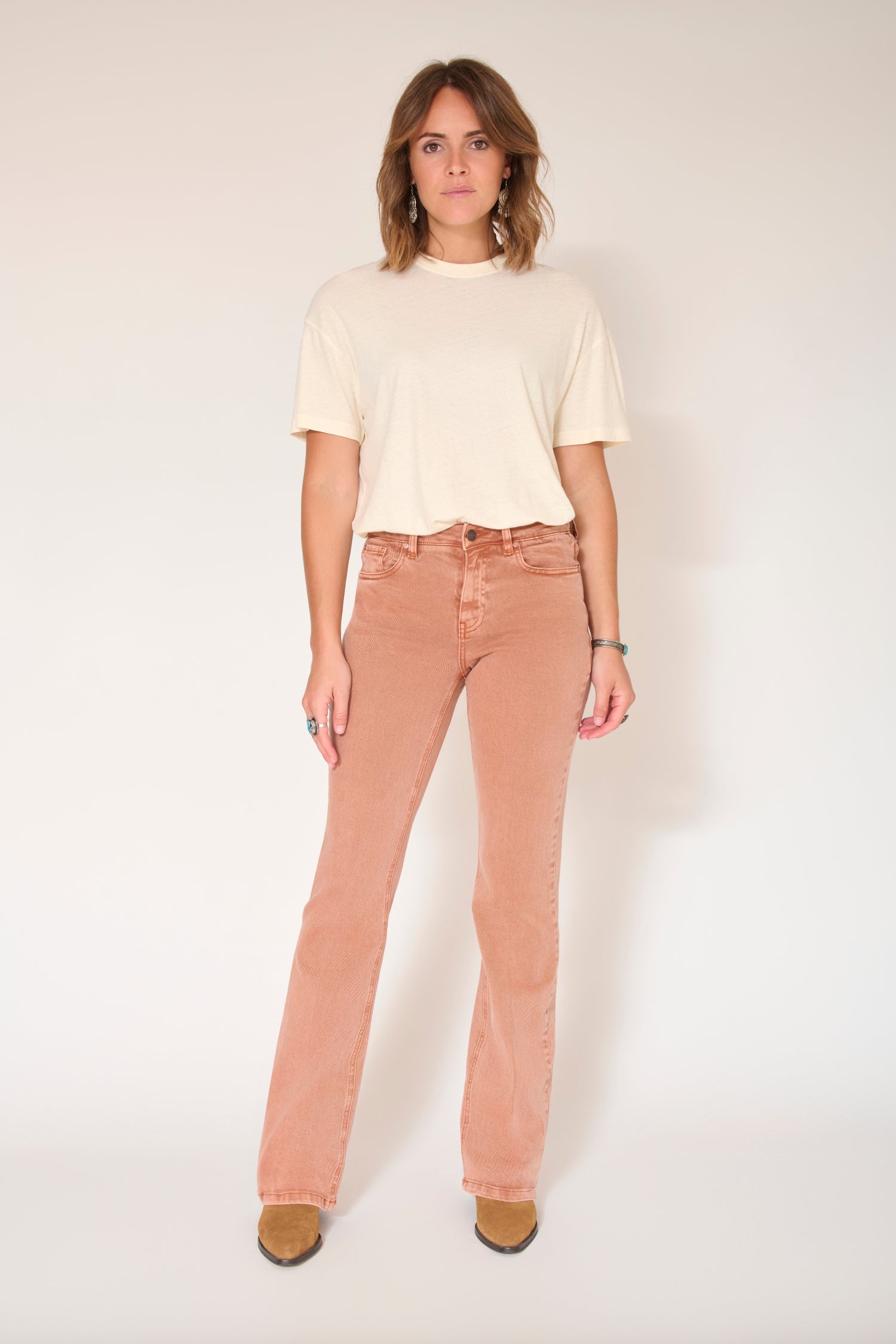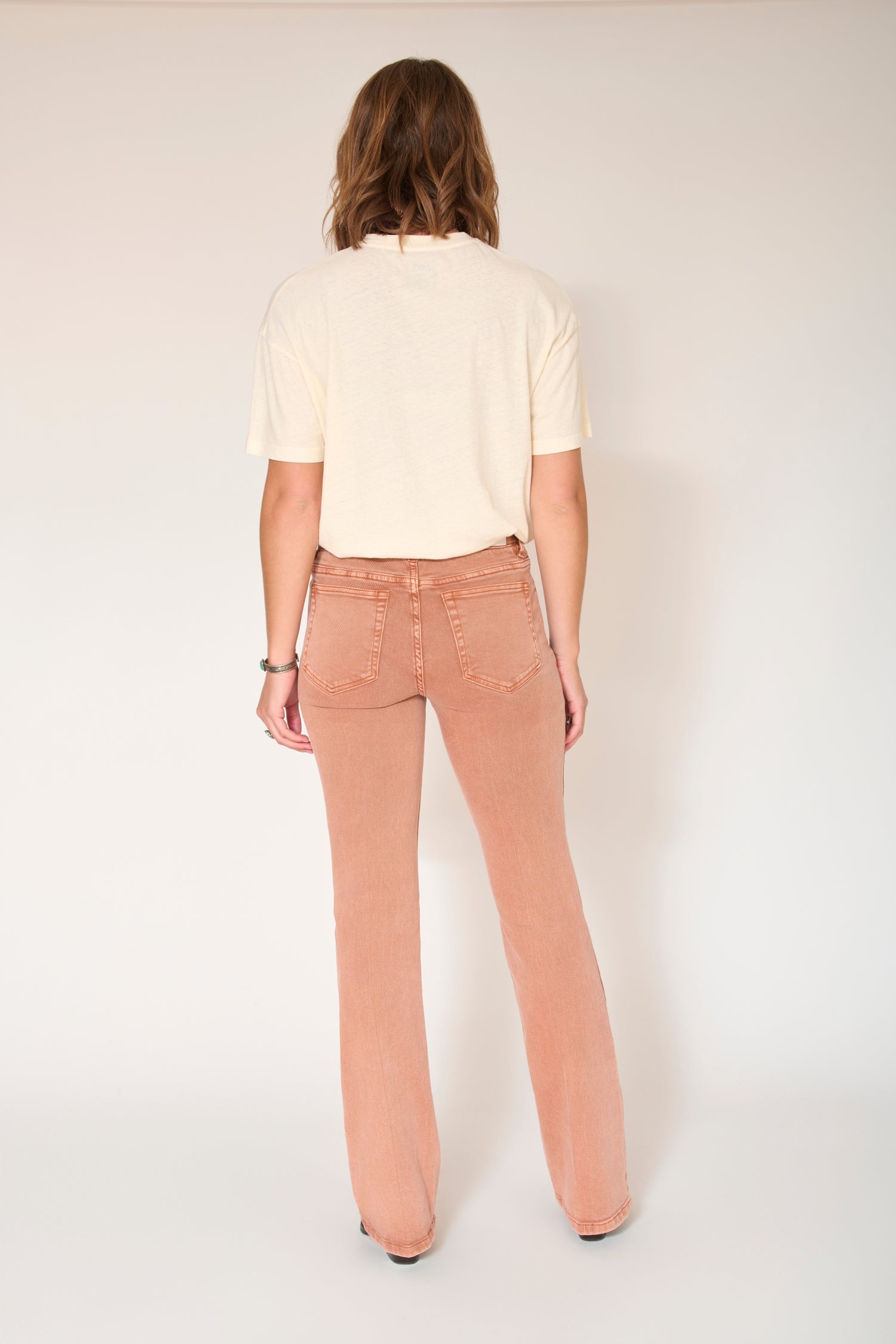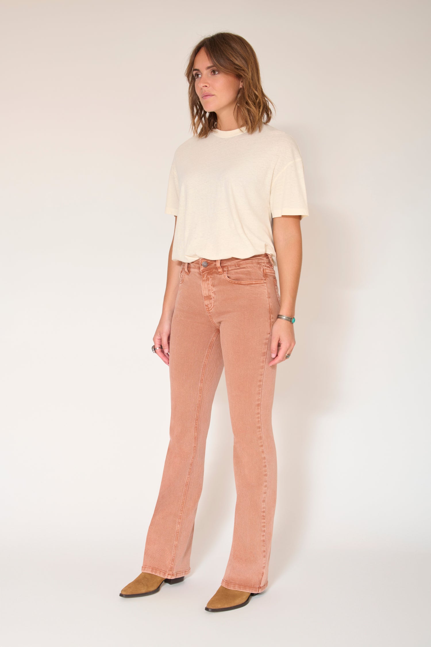 Sa coupe flare est conçue pour flatter la silhouette, s'ajustant parfaitement aux hanches avant de s'élargir progressivement vers le bas. Ce style évasé permet d'allonger visuellement les jambes tout en offrant une aisance de mouvement optimale. Le jean est également équipé de poches arrière pratiques et d'une taille classique, avec une fermeture à bouton et zip.