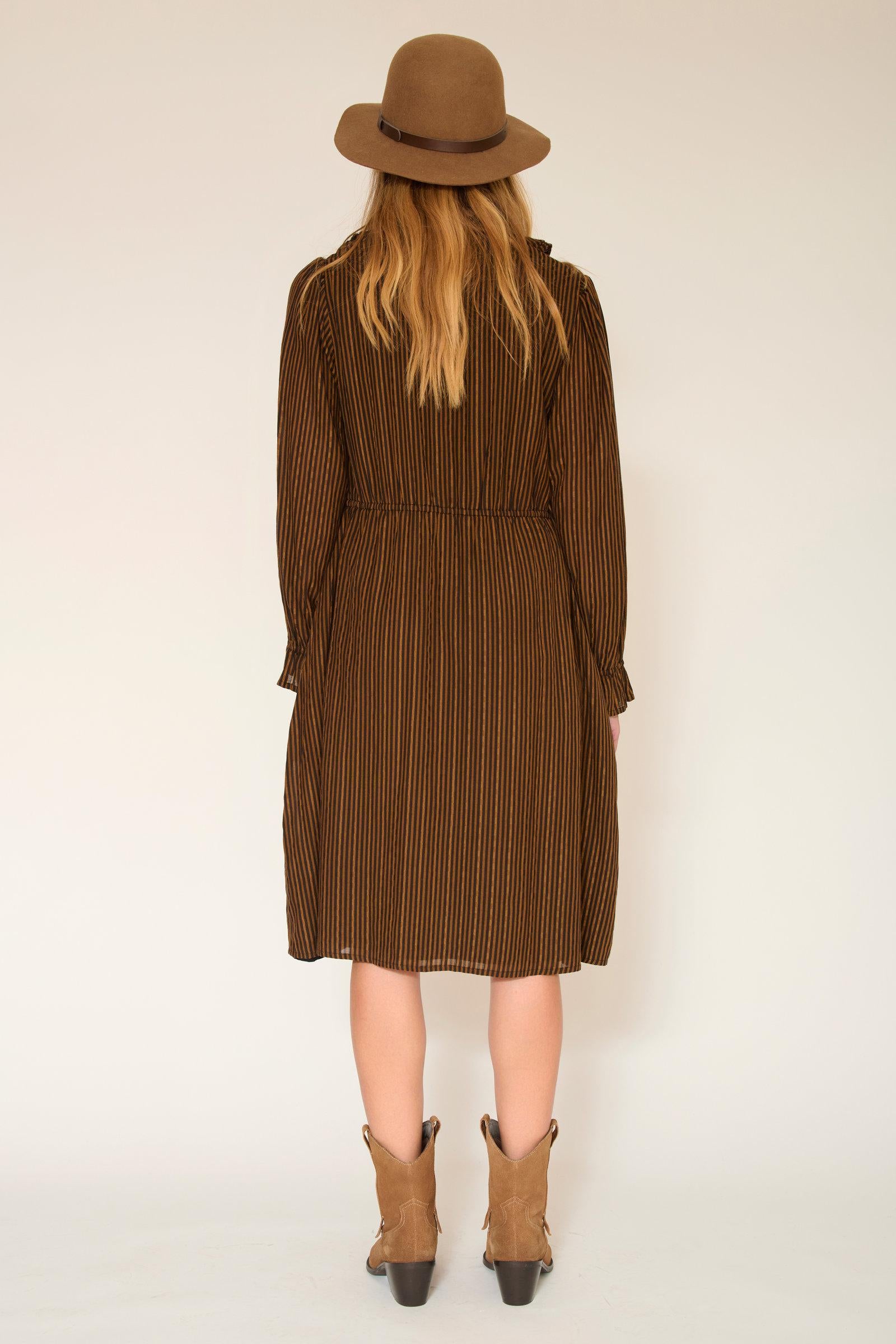 La robe RAFAELA BROWN est une pièce élégante et décontractée, idéale pour un look à la fois chic et confortable. Sa teinte marron riche, ornée de fines rayures verticales, ajoute une touche de dynamisme au design.
