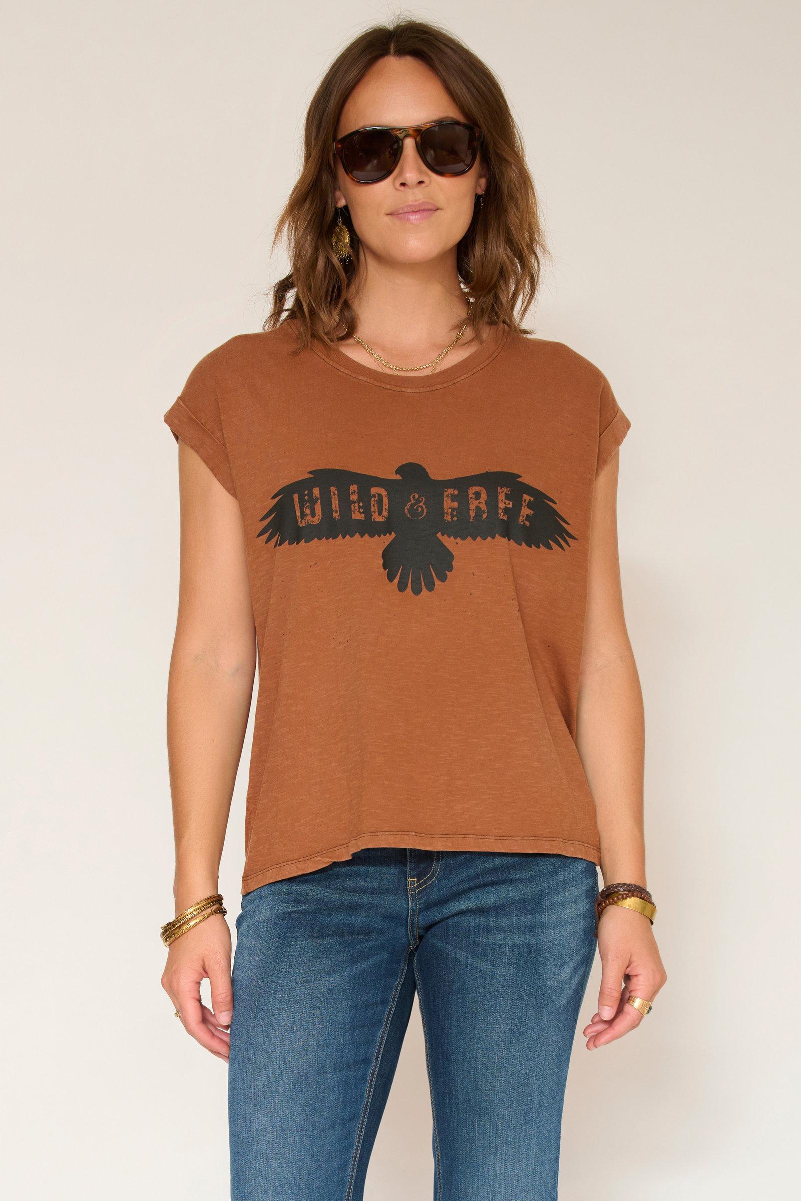 Le devant du tee-shirt présente un motif graphique représentant un oiseau, accompagné du texte "WILD & FREE", ce qui lui confère une personnalité unique et originale. À l'arrière, la partie simple et sans motifs permet de garder un équilibre visuel, rendant le tee-shirt à la fois élégant et décontracté.