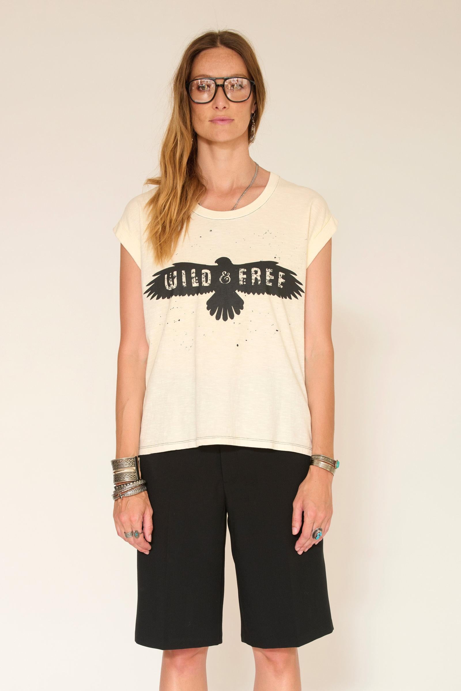 Ce modèle présente un motif graphique sur le devant, représentant un oiseau accompagné des mots "WILD & FREE" en noir. Ce design artistique apporte une touche décontractée et moderne, parfaite pour un look quotidien.