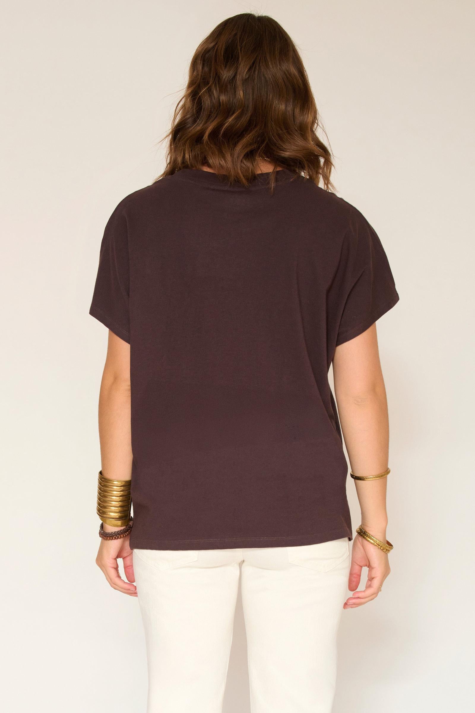 À l'arrière, le tee-shirt présente une finition simple, sans motifs, ce qui le rend facile à associer avec divers types de bas, que ce soit des pantalons, des jupes ou des shorts. Ce modèle est idéal pour des occasions variées, allant d'une sortie décontractée à un look plus habillé en l'accessoirisant judicieusement.