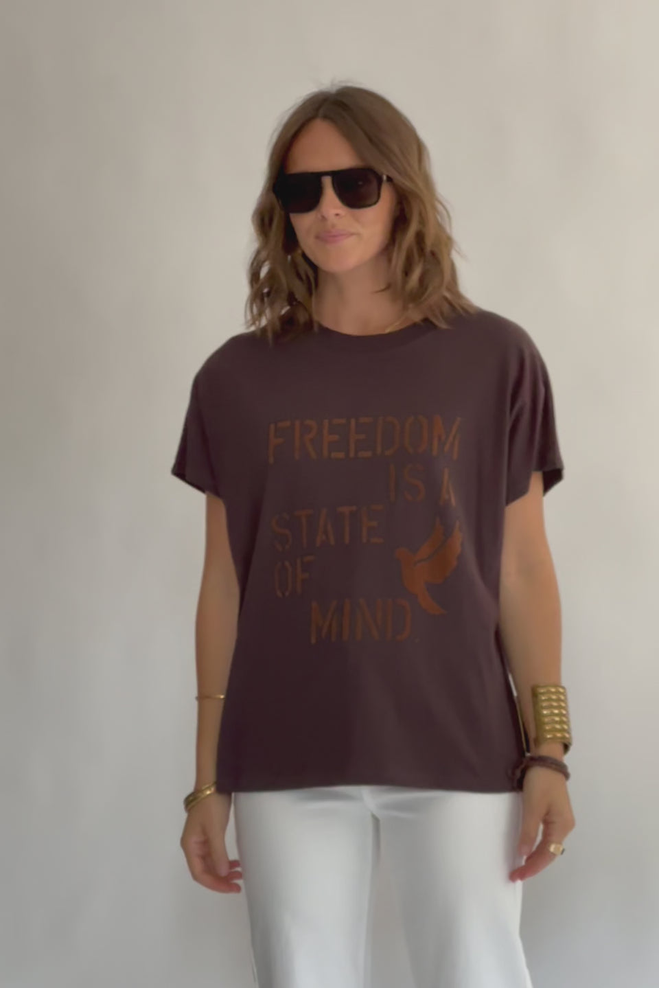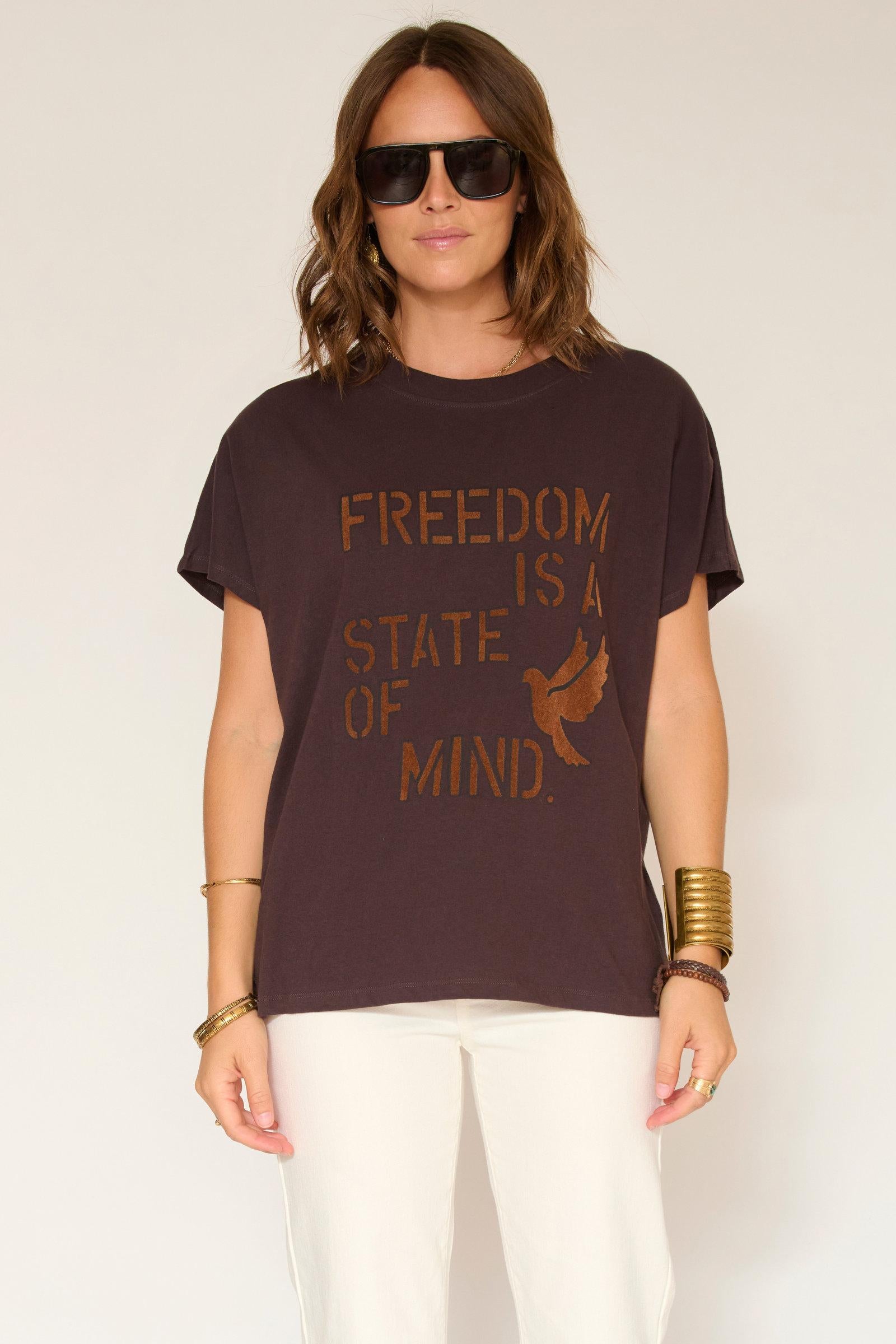 Sur le devant, il arbore un message inspirant en lettres dorées : "FREEDOM IS A STATE OF MIND", accompagné d'une illustration d'une colombe, symbole de paix et de liberté. Ce design unique fait de ce tee-shirt un choix parfait pour ceux qui souhaitent exprimer leur personnalité tout en restant à l'aise.