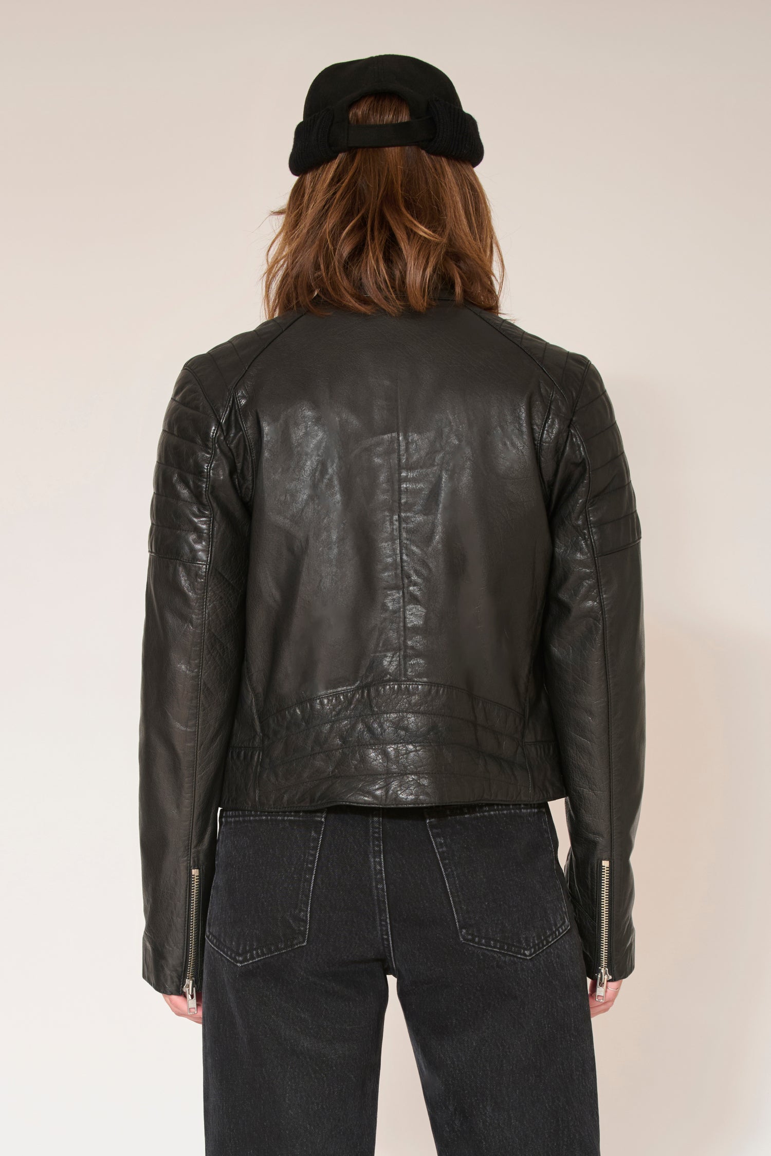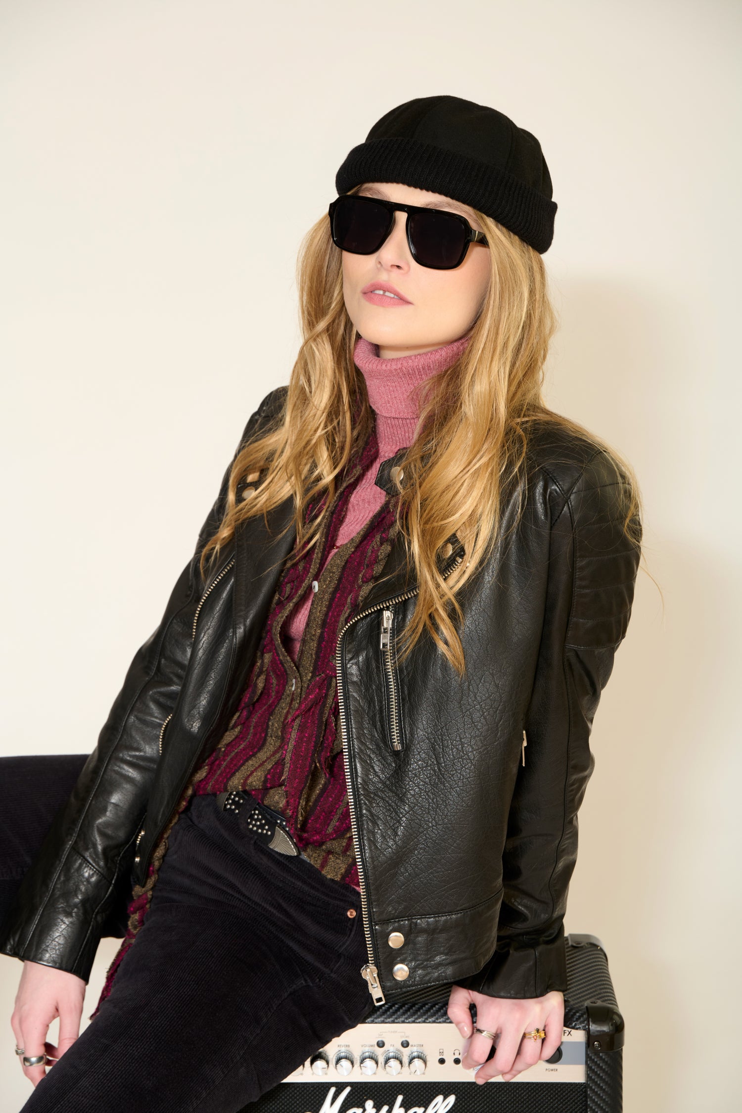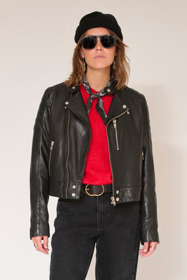 Notre veste en cuir noir VIGRID, col rond et manches longues dans une coupe motard tendance. Elle donnera du caractère à votre tenue en ajoutant une touche légèrement masculine.